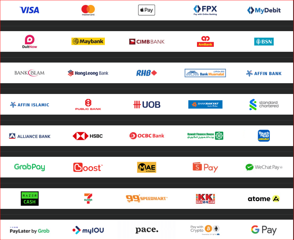 MN Redmount Enterprise telah bekerjasama dengan Razer Merchant Services, Stripe dan Paypal